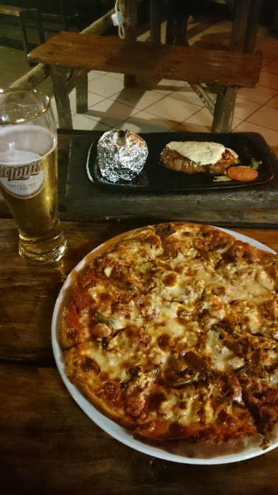 Vi ankom vårt hotell i Botswanas huvudstad kl. 21 och begav oss raka vägen till Bull & Bush pub som vi hade läst om i Lonely Planet. I och med att det var torsdag så var det steak- & pizzanight! Är det något som de botswanska kockarna kan så är det sina stekar och pizzor, wow alltså!! Dotterns favoritmat är pizza så hon vad gladast av alla! Vi sköljde ner maten med några glas av den lokala ölen St. Louis. Det var en av de mysigaste kvällarna på resan.