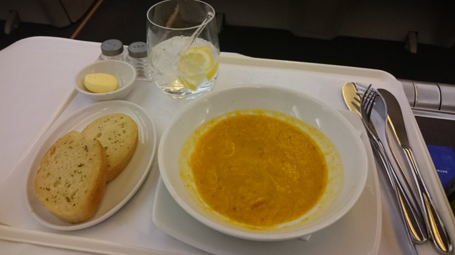 Återigen ganska låg beläggning i business class på denna flygning som var beräknad till 2 h. Businesskabinen bestod av sex rader sköna säten med konfigurationen 2-2. Serveringen inleddes med dryckesvagnen (tyvärr inte med nötter eller dylikt). Lunchen var väldigt god och bestod av mör kyckling, potatisgratäng och vitlöksbröd till varmrätt, sallad med oliver till förrätt och en god mousse till efterrätt. Till detta inmundigades det öl och några glas rödvin.