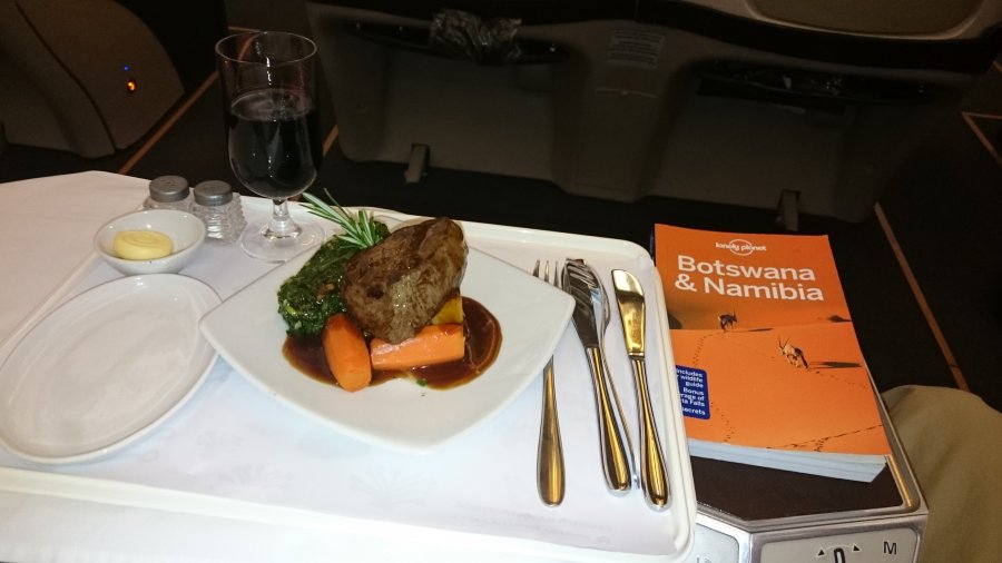 Därefter fick jag den möraste köttbiten jag ätit på ett plan! Köttet serverades med potatissticks och madeirasås. Till detta ett glas rödvin av den sydafrikanska druvan Pinotage, som sedermera skulle bli vår favoritdruva i Sydafrika.