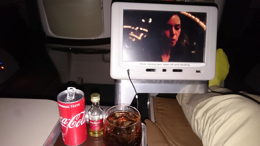 Mitt kött var rött och fint medan frugan fick en köttbit torr som en skosula. Bitarna var lika stora så vi undrade hur den enda kunde blir så perfekt men inte den andra? Till efterrätt tog jag en osttallrik! Och såklart avslutade vi middagen med ett glas av Afrikas stolthet, Amarula! (jag gillar egentligen inte likör men Amarula är något speciellt)! Efter maten somnade även frugan medan jag ville kolla på film. Teven var ungefär som i SAS go i gamla kabinen, alltså inget att hurra för. Utbudet var det dock inget fel på. Jag frågade flygvärdinnan efter någon lokal sydafrikansk dricka och in fick jag Klipdrift och Cola vilket smakade väldigt bra!