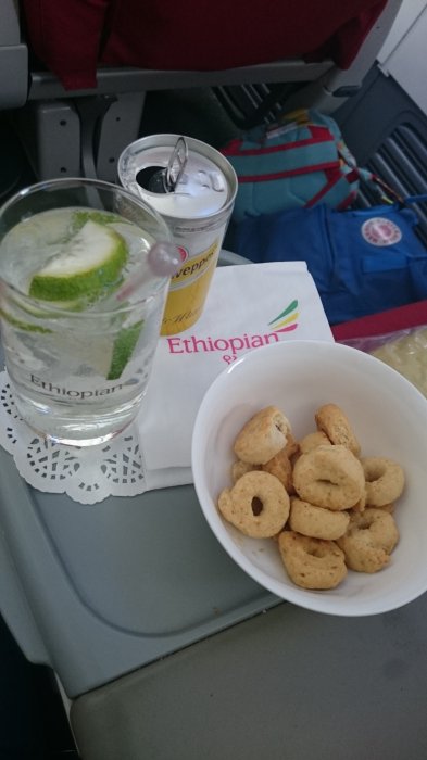 Ett glas skumpa före take off och hejdå Botswana! Uppe i luften serverades det GT (Ethiopian serverar Gordon´s gin) med proportionerna 7 delar gin och 3 delar tonic och något slags kex, gott! Till förrätt serverades det kyckling med en ärt- och majsröra!