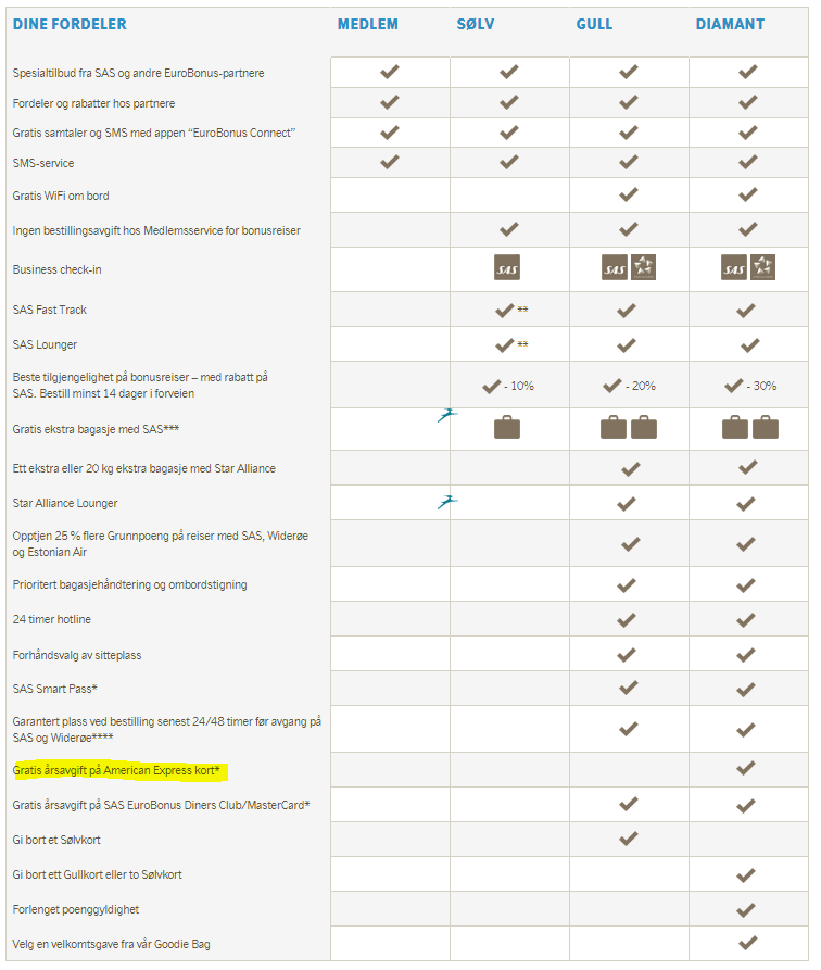Om man tittar på sas.se så ser tabellen annorlunda ut. Inget om gratis årsavgift på Amex där. Kan det vara olika beroende på land?