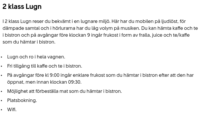 "I 2 klass Lugn reser du bekvämt i en lugnare miljö. Här har du mobilen på ljudlöst, för dämpade samtal och i hörlurarna har du låg volym på musiken."