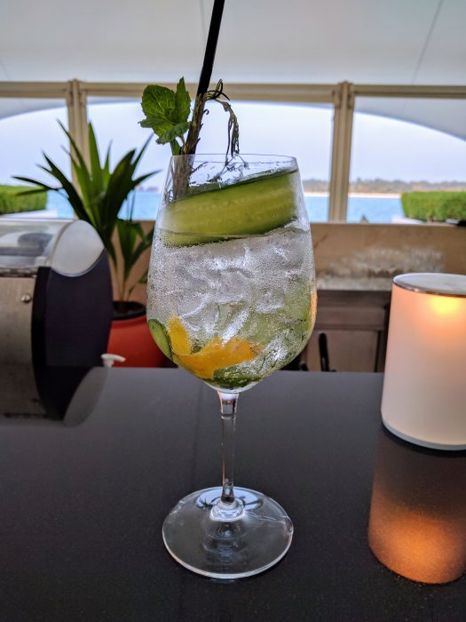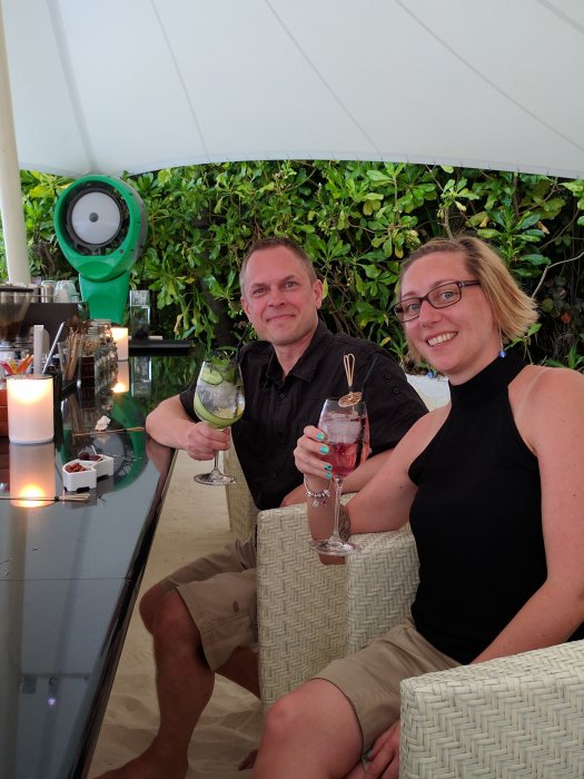 Ganska långt att ta sig hit till Vilu efter Afternoon Tea. Bägge ställena ligger på respektive nordända på varje ö. Smidigast är att beställa en buggy vid 16:30 eller strax efter så man hinner till kl 17 för lite drinkar och kanapeer!