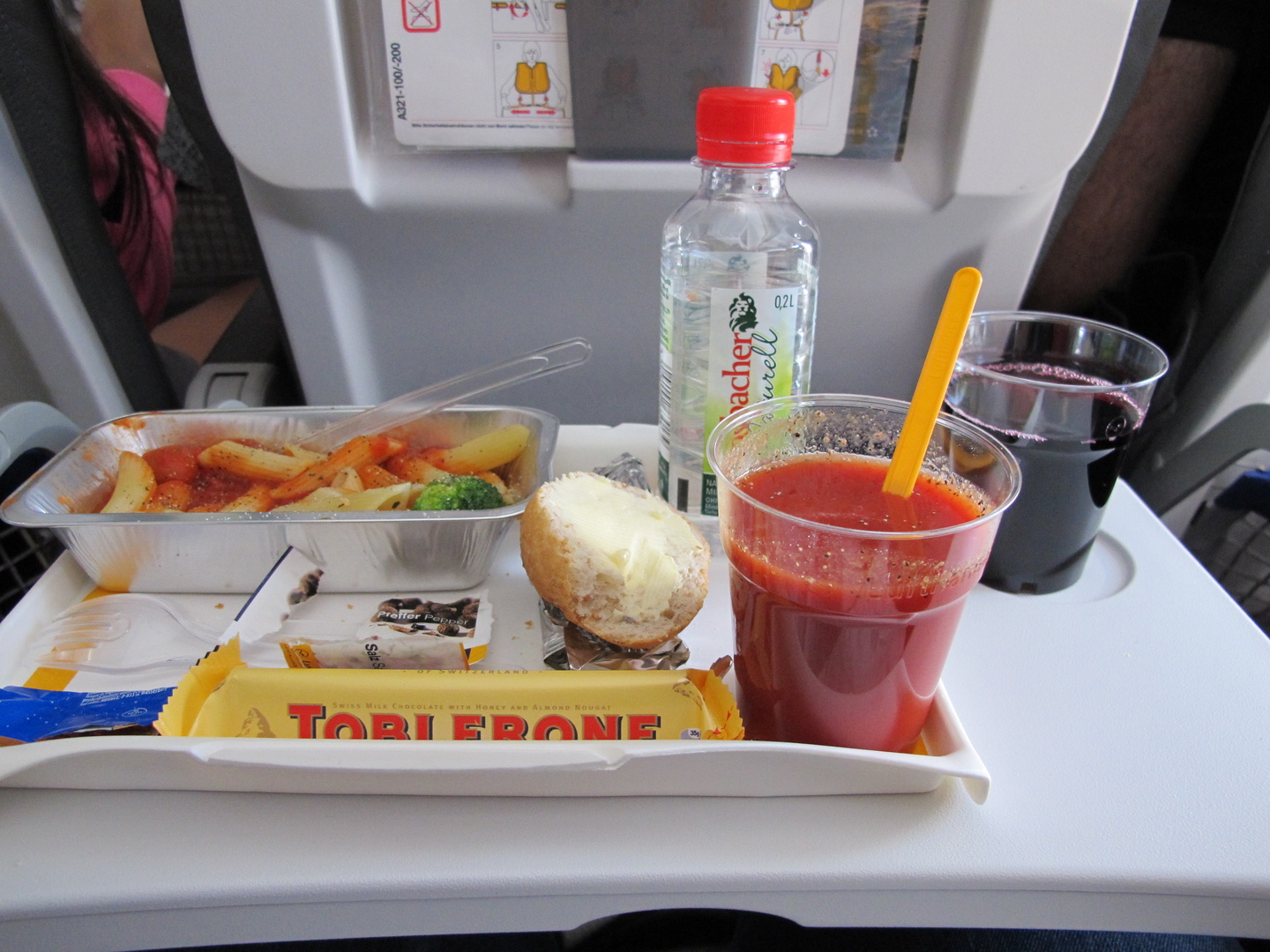Benutrymmet var mer än ok och maten, pasta med tomatsås, smakade också bra. Inget att klaga på. Dessutom serverades öl och vin, till och med bubbelvin, frikostigt. Sova kändes onödigt så vi tillbringade den ganska korta flygresan med att läsa och inta alkoholhaltiga drycker