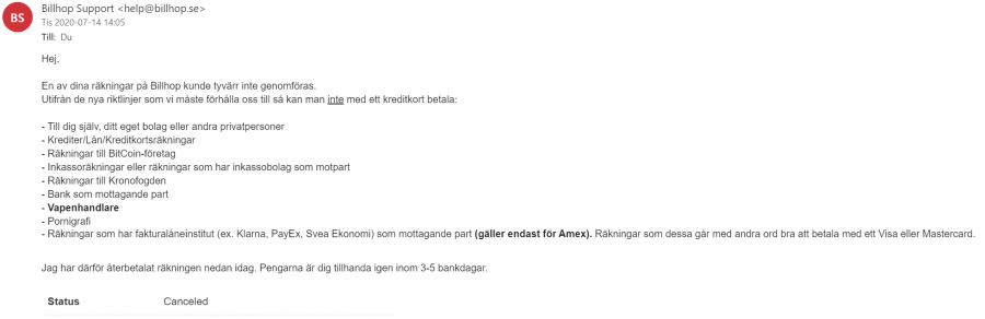 Efter ett par dagar så får jag ett mejl av någon på Billhops kundtjänst att dom skulle annulera betalning och återföra pengarna till mitt kreditkort.