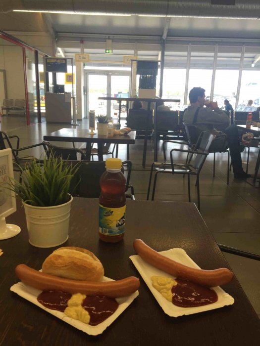 Teoretiskt kommer PS businessbiljetter med flygplatslounge-arrangemang. Detta är omöjligt i Non-Schengen-delen av Terminal C – det finns ingen lounge. Det finns bara några bänkar framför gaterna och ett litet café. Vid inchekningen hade PS givit mig en värdevoucher för 13 Eur. Jag gick därför fram till cafét och kollade vad som fanns. Det var korv, kaffe, några kakor, öl och kalla drycker som stod till buds. Jag valde korv och isté. Försäljerskan var förvånad att jag inte ville utnyttja det fulla värdet av kupongen, så hon prackade på mig ytterligare en korv.