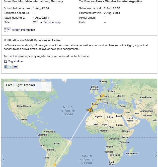 De enda rutterna som går västerut under nattetid är till Sydamerika, och då herr Agehall är ute efter att maximera F-upplevelsen ombord så gissar jag att han har valt Lufthansas längsta rutt sett både till distans och flygtid, nämligen Buenos Aires. 7132 miles och 13h 50m i flygtid.
