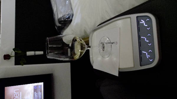 Stolen är väldigt bekväm och man skulle lätt kunna göra 13h i bara den, även om den inte blir lay-flat när man fäller den. Dock är det en ärthjärna som aldrig har flugit som designat den. Det visar sig att de knappar som används för att kontrollera stolen, sitter på kanten av den lilla platform där man förvarar sitt champangeglas när bordet inte är uppfällt. Detta gör att, om man som jag vill hålla i sitt glas, vilar handen på knapparna vilket triggar stolen att röra sig! Däremot kan det vara jättesvårt att få något att hända när man faktiskt försöker trycka på knapparna. Detta är skitstörigt och jag fattar inte hur man kan göra en sådan designmiss. Fjärrkontrollen till IFE ligger tex under ett litet lock och man borde ha gjort samma lösning för stolskontrollerna.