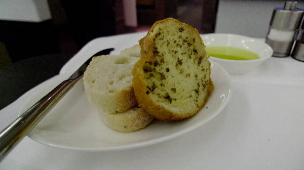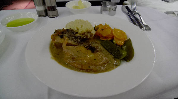 Till att börja med serverades förstås kaviar. Det får man ju inte missa. Därefter fanns ett antal förrätter att välja på. Jag såg dock ingen som jag var sugen på och bestämde mig därför att gå direkt på huvudrätten - kyckling med murkelsås, karmelliserade morötter och rökt paella ris. Givetvis får man inte missa vitlöksbrödet som serveras till.