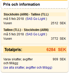 Agö skrev: Till skillnad från SAS då menar du? Billigaste direkta T&R på måndag. Visa bifogad bild 72582 Klicka för att utvidga... Exakt, på min senaste resa till Tallinn blev det Silja Line i stället för flyg, av kostnadsskäl.