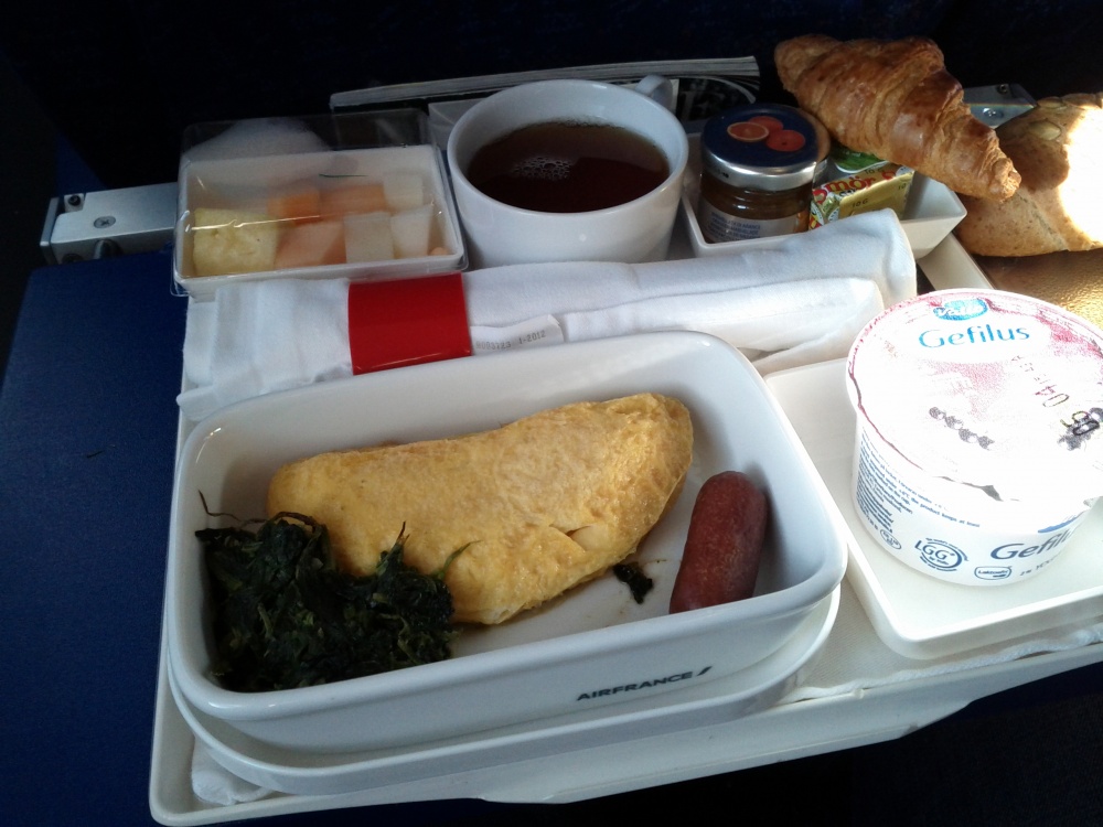 Efter avgång så serverades frukost. Varm sådan: liten omelett, korv, sauterade grönsaker, yoghurt, croissant med tillbehör, frukt och juice. Och, kaffe förstås.