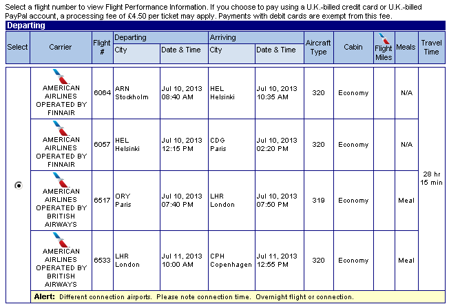 Jag har inte lyckats att gå till betalningssidan men man får följande routing när man söker Stockholm->Köpenhamn på AA.com. Alla flighter är med AA flightnummer.