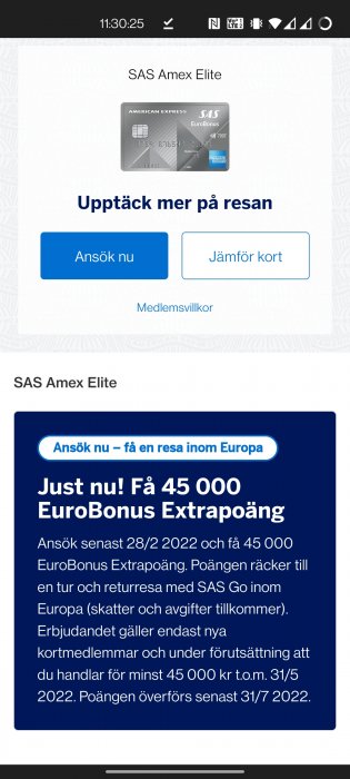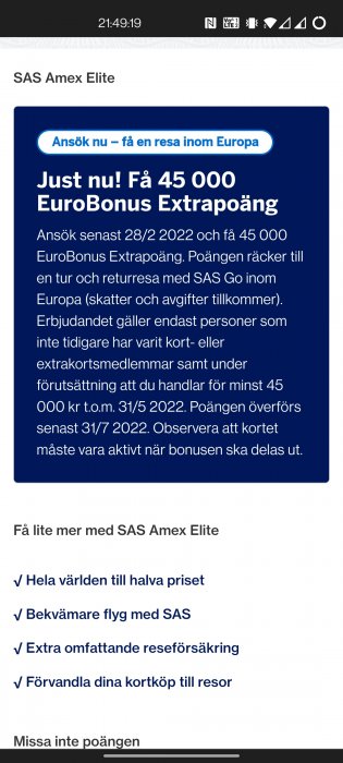Kunde idag konstatera att min partner (som har ett extrakort till mitt Platinum) kan känna sig blåst på den signup-bonus på 45000 extrapoäng som erbjuds just nu. Tog en skärmdump när ansökan skickades för drygt en vecka sedan och en idag. Från att erbjudandet bara gäller nya medlemmar (som betytt tidigare att man inte varit medlem senaste 6 månaderna eller bara har extrakort) har de nu ändrat att man inte ska har varit kort- eller extrakortsmedlem tidigare. Tolkar det som att man aldrig ska ha haft ett Amexkort tidigare, någonsin. Tror många blir besvikna när det är dags för utbetalning av bonus. Screenshot_20220220-214919.jpg Screenshot_20220213-113025.jpg
