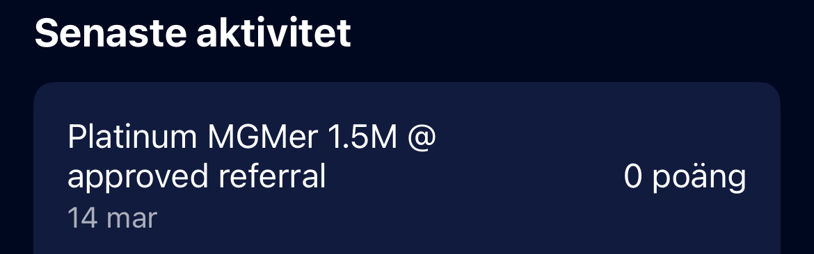When is this showing normally? I referred someone mid March but nothing for now.Ser det ut såhär för dig också? Amex-supporten var inte till så mycket hjälp. Antar det uppdateras när väl poängen kommer? Ansökan har blivit godkänd redan. Visa bifogad bild 163363