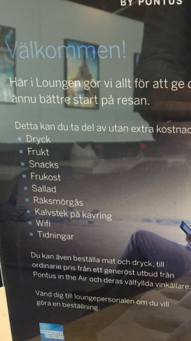 Enligt anslag så är utbudet som ingår dryck (vet inte om/vad i alkoholväg som ingår, fick bara uppläst ramlösa, kaffe, och just nu ett glas champagne), frukt, snacks, frukost, sallad (en laxsallad idag), räksmörgås, kalvstek på kavring.