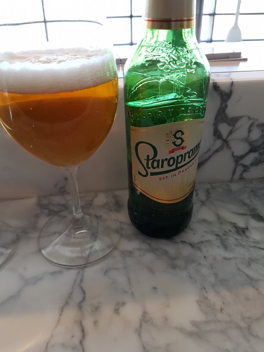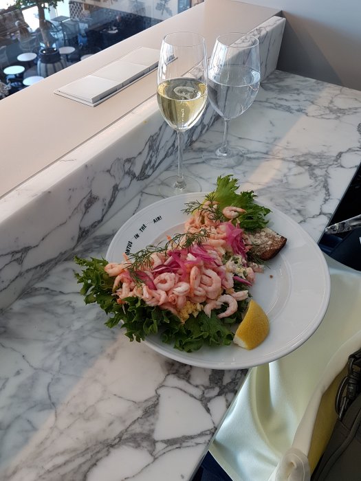 Ett glas champagne, räkmackan, cappuchino och bra fika och så sköljer vi ner det med en Staropramen. Allt utom champagne är inkluderat i normala fall men under sommaren får man ett glas gratis.