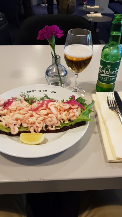 Så himla snyggt att de alltid har texten på tallriken "klockan 12". Har inte sett ett foto från Pontus där texten är "felplacerad". Attention to detailMycket gott med en räkmacka till ölen!