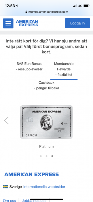 Välkommen hit! Du kan välja vilket kort du vill ha när du klickat på länken. Klicka på ”Välj annat kort” och sedan ”Membership rewards” så dyker Platinum upp!