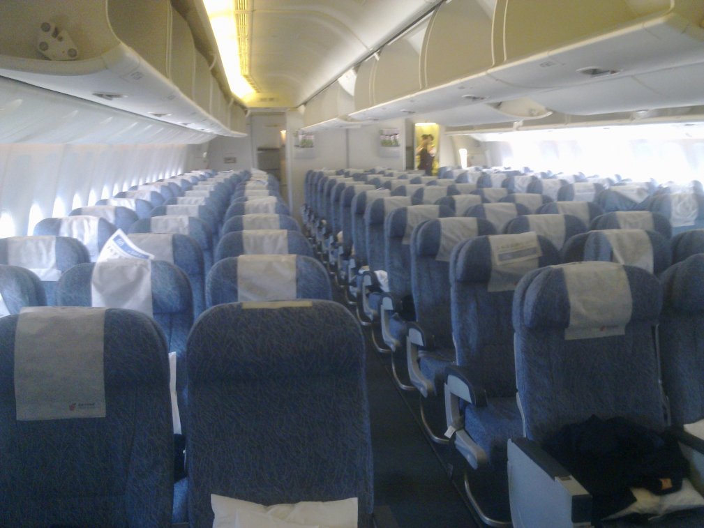 Bild tagen från sätet. Notera takhöjden och bagageförvaringen. De korta flygvärdinnorna hade lite problem att nå upp för att stänga dem.