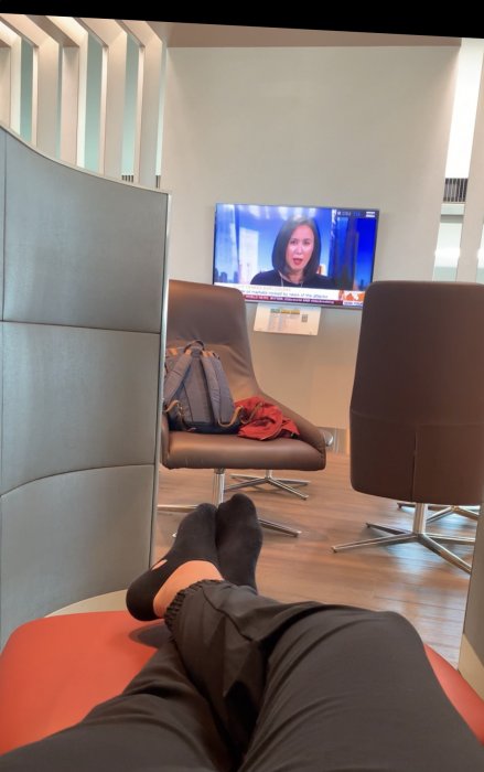 Tillbaka på flygplatsen nyttjas duscharna och vi softar i vad jag ändå kan känna är en ganska stökig lounge (åter igen, ej guld) innan boarding på business.