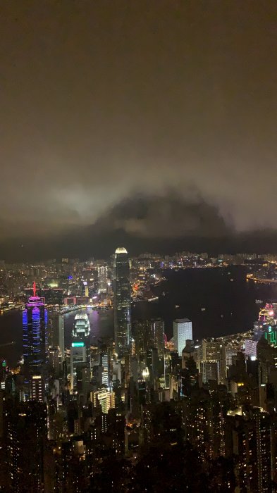 Victoria Peak-utsikten på kvällen. Upplevs bäst via "the morning trail", ett promenadspår som löper runtom toppen, där slipper man också horderna av människor som ska fota från The Peak-tornet.