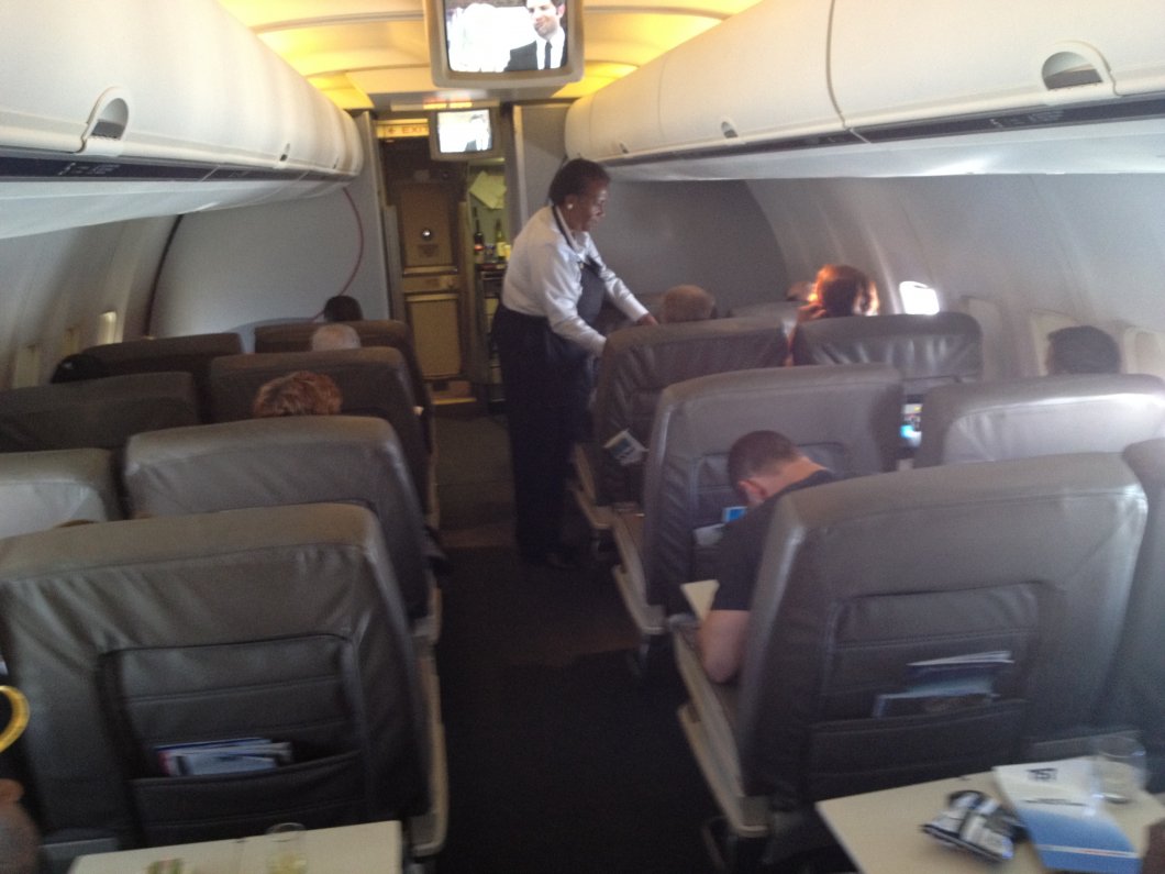 Snabb check-in, trots lång kö. Min polare hade två väskor, jag handbagage som vanligt. Nackdelen på Term A och B på EWR är att gaterna är placerat som små ”öar”. T.ex. så delar US Airways och AA en ”ö”. Det skapar en lång samt mycket trång passage för säkerhet. Det finns en AA Priority Access, men den hjälper inte så mycket. Standard TSA procedur med skor av, laptop (dock ej iPad) ur väskan och dessa nya röntgen maskiner. Det är tidigt som ’attan, och jag behöver kaffe! Allt som allt tar det ca 20min från Hilton bussen tills vi är genom. Tack för F och OW Emerald status. Vi hade fått veta att flighten var 30min då manskapet var sena kvällen innan, så vi hade bra med tid.