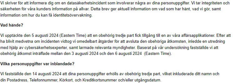 Vi skriver för att informera dig om en datasäkerhetsincident som involverar några av dina personuppgifter. Vi tar integriteten och säkerheten för våra kunders information på allvar. Detta brev ger aktuell information om vad som har hänt, vad vi gör, samt information om hur du kan få identitetsövervakning.