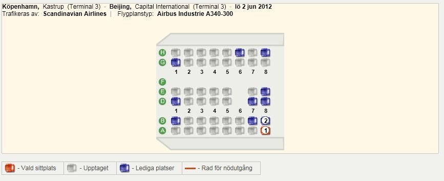 Reser till Peking på Lördag med A340-300 och platstillgången ser ut enligt bifogad bild, där jag och min kollega är seatade på 8A+B. Verkar vara delade mening om dessa plaster, bör man byta till någon annan? Kanske dela på sig och ta varsin sida på första raden?