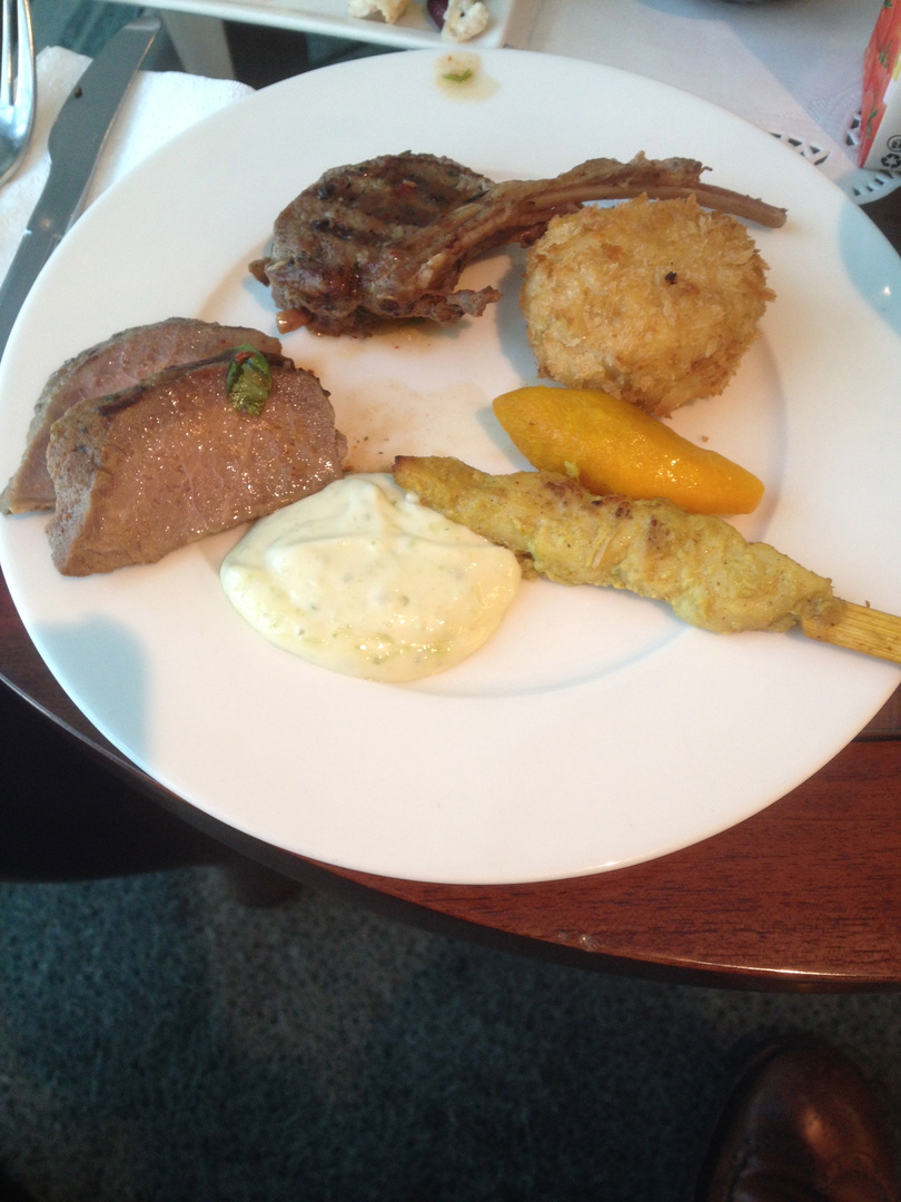 Servering inleds nån knapp timme efter start. Återigen är det svinhög klass på maten. Äter fisk till huvudrätt den här gången och den skulle faktiskt kunnat serverats på en fyrplussig restaurang. Till förrätt rullas en vagn ut där man får välja vad man vill ha bland en massa olika godsaker. Samma sak gällande efterrätterna.