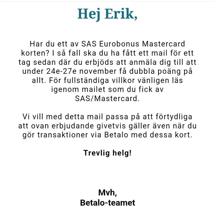 Det brukar väl vara en dubbel poäng kampanj i februari, kan vara värt att avvakta den och se hur det funkar med det nya systemet.Är u valet och kvalet kring mitt SAS Premium MC och funderar på om ett sätt skulle kunna vara att använda det för Betalo/Billhop och ha kvar det under våren iaf för att få lite extra baspoäng, med de nya reglerna. Tänker jag rätt? Råd?