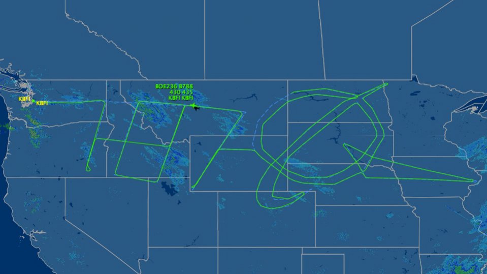 Boeing har humor. Med hjälp av en gps-tracker ritade Boeing ut 787:ans namn och Boeings logotyp över hela USA. Sen flög de efter denna flygrutt, från delstaten Washington till Iowa.