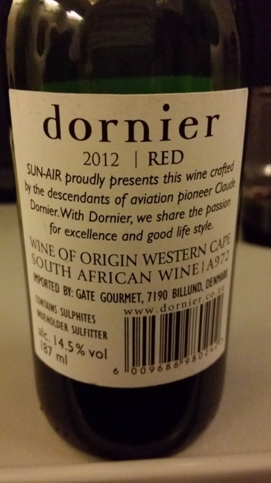 Rodvinet jag tog serverades i en glasflaska och var deras eget marke, Dornier efter flygplanet.