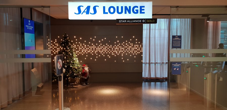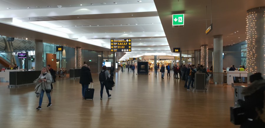 Gick ut, ner och bort förbi taxfree. Jag ser loungen härifrån. Precis bredvid julgranen... DÄR, säger jag och pekar till killen i säkerhetskontrollen där det står NO ENTRY - CREW ONLY på hela dörren. Sorry, du må gå hele veien ut og runt - säger han på lite go hurtig norska.
