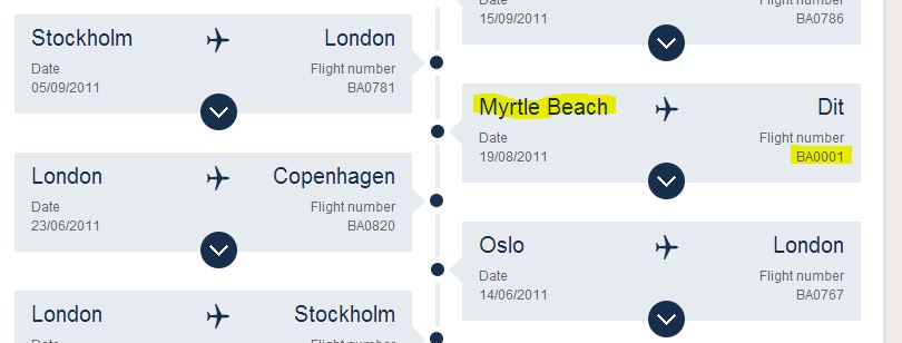 Går BA0001 inte från Myrtle Beach till Dit om man skall läsa bilden rätt?