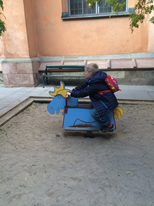 Det är halvdåligt med lekplatser i centrala Stockholm (vi kände inte för Humlegården idag) men på ytan mellan Storkyrkan och Nobelmuseet finns i alla fall en gungälg.