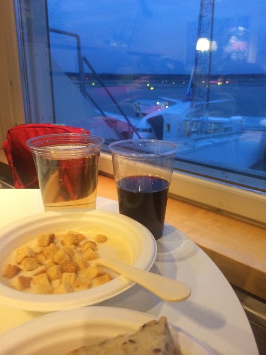 En liten lätt middag i loungen, denna kväll bjöd SAS på blomkålssoppa