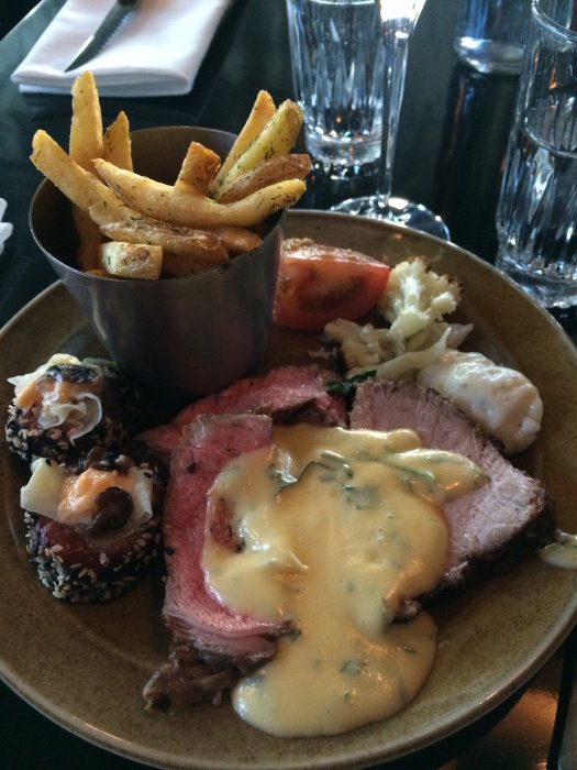 Varmrätt - Råbiff!, kalventrecote, flankstek, blomkål, pommes, tryffelmajonnäs och bearnaisesås