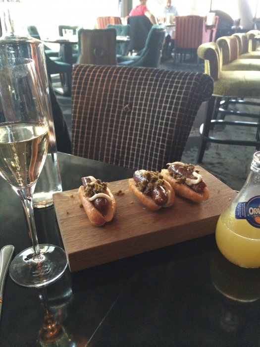 Nu var det lyckligtvis inte så utan restaurangen öppnade på utsatt tid. En snabb titt på buffén visade att resan skulle vara värt besväret. Dryck beställdes in Mimosa, champagne och Orangina.