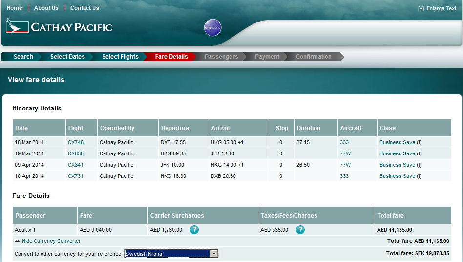 Det går att boka på Cathay Pacifics webbsida i Förenade Arabemiraterna.