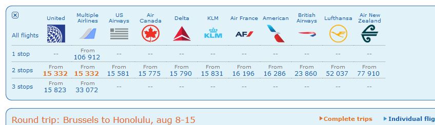 Routing: t ex Bryssel-(BA)-London-(BA/AA)-Los Angeles-(AA)-Honolulu