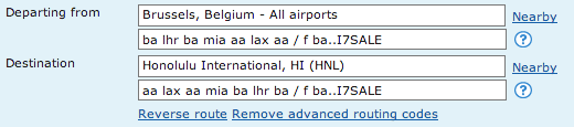 Routing: t ex Bryssel-(BA)-London-(BA)-Los Angeles/San Francisco-(BA: AA)-Honolulu