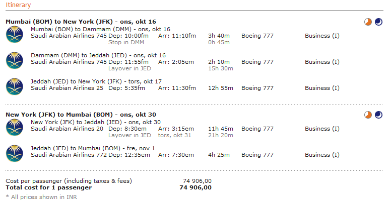 [Business class] Delhi/Mumbai-New York/Washigton T/R, Saudia, 27.000 SEK inkl. skatt