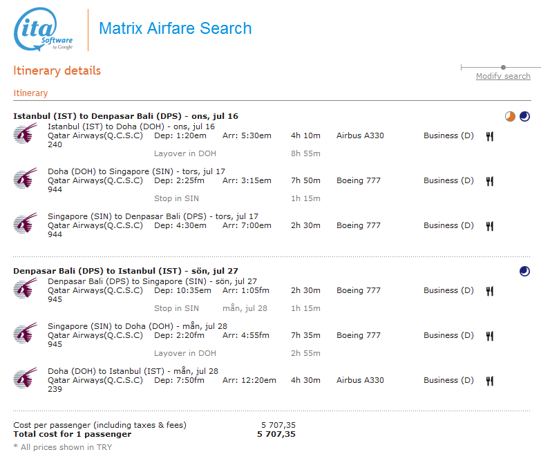 Routing: Istanbul-(QR)-Doha-(QR via Singapore)-Denpasar