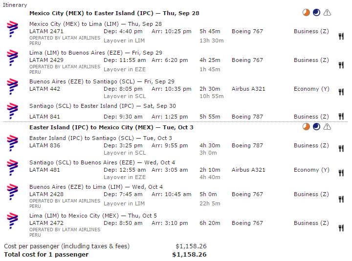 [Business Class] Mexico City-Påskön T/R, LATAM, 1.160 USD inkl. skatter