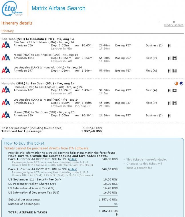 [Business class] San Juan-Honolulu T/R, American Airlines, 9.700 SEK inkl. skatter