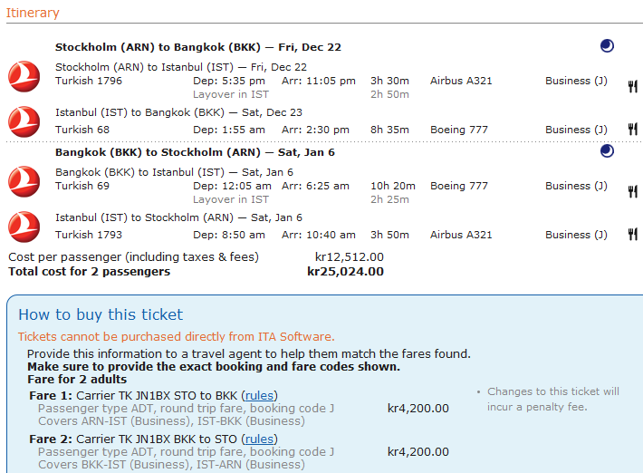 Du citerade inte vilket pris du syftade på och trådrubriken säger "[Business class] Stockholm-Bangkok T_R, Turkish Airlines, 12.500 SEK inkl. skatter" ju.Tack snälla Dr. Miles. Jag såg denna också men det verkar vara "normal" pris för Turkish. Min förhoppning är att komma under 10.000 kr per biljett i business. Min förhoppning står till kampanj på Turkish alternativt att Quatar kör sin 2-4-1 i business. då brukar det landa på ca 9.500 per biljett.