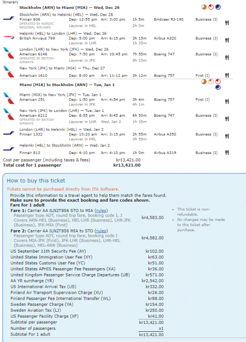 Routing: t ex Stockholm/Göteborg-(AY/BA/IB)-London/Helsingfors/Madrid-(AA/AY/BA/IB)-utvalda destinationer i Nordamerika