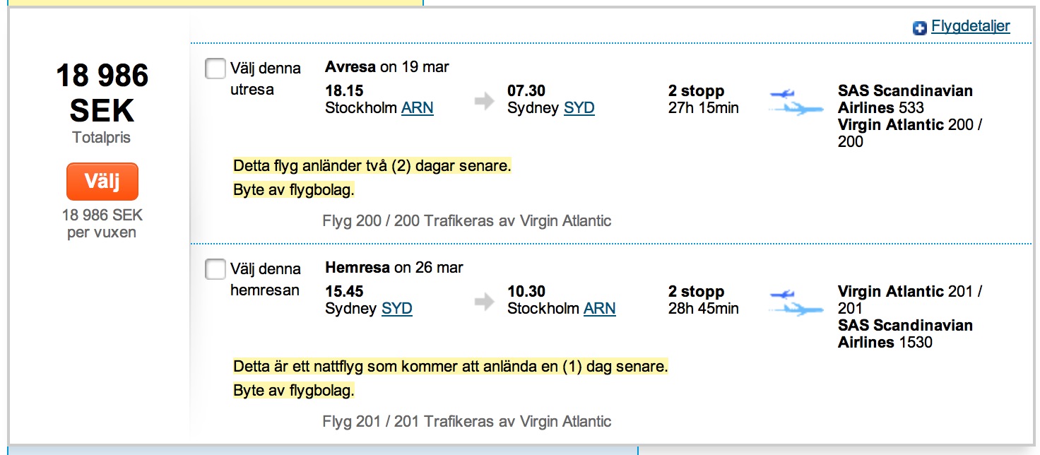 [Business class] Stockholm/Göteborg-Sydney T/R, Virgin Atlantic, 19.500 SEK inkl.