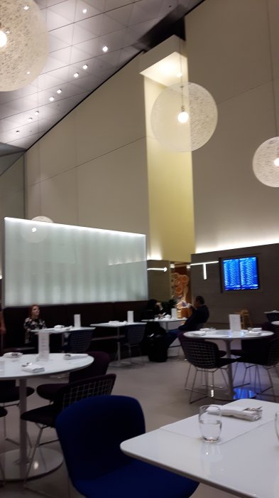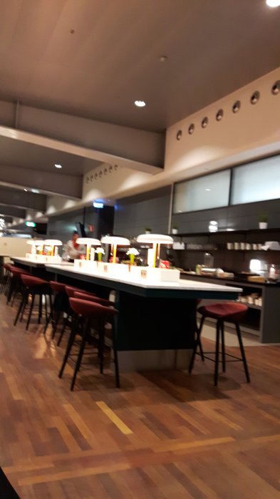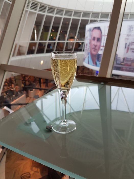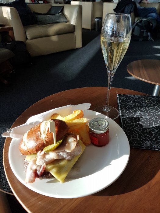 Tvärs över bordet, till och medLång kö i Security. Nu Cava i SAS gold lounge CPH. Rökt lax och mycket folk.